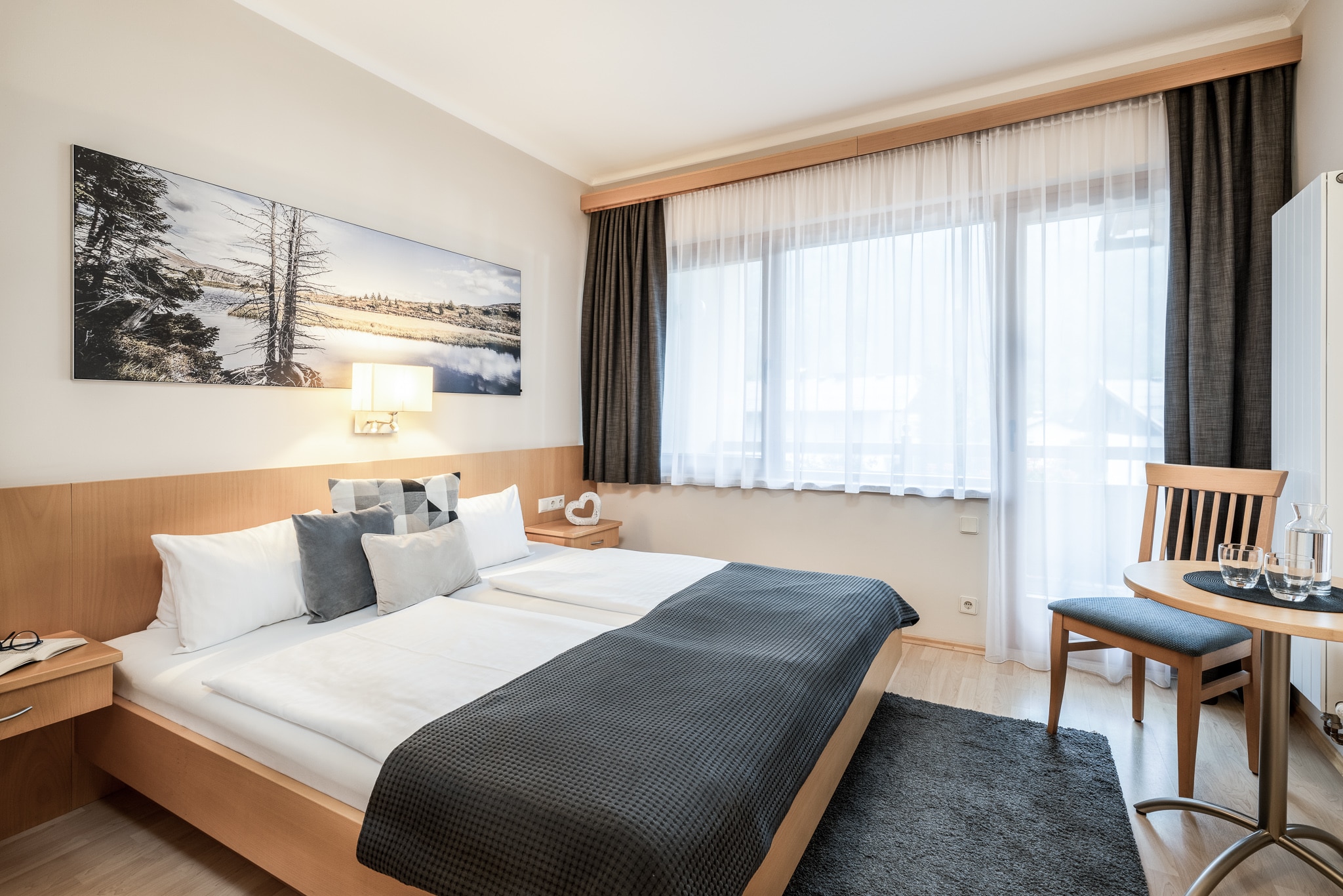 With up to 20m², our double room is ideal for 2 persons, with a sleeping area, shower and WC. The bright and friendly design in combination with real wood furniture, a large expanse of window and a balcony, together with the peaceful location, all ensure your comfort during your stay.